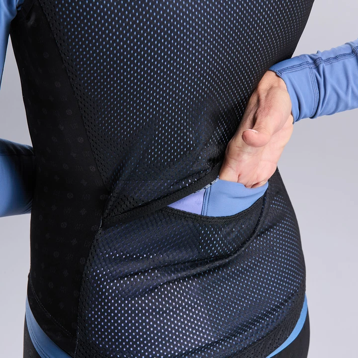 Léger et respirant, avec un dos en mesh, il protège sans alourdir. Sa coupe ajustée sans pli et sa finition mate, sobre et élégante, signent l’esthétique féminine de la collection.